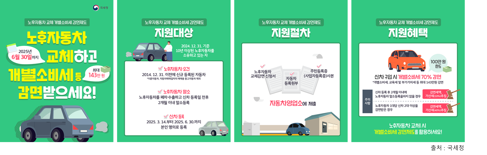 노후차를 보유하고 계신다면, 이번 노후자동차 교체 개별소비세 감면제도를 꼼꼼히 확인하시고, 2025년 6월 30일 전까지 알차게 활용해 보시기 바랍니다.