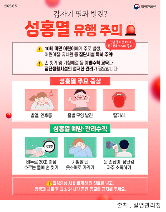최근 어린이집과 유치원, 초등학교를 중심으로 다시금 성홍열이 유행하고 있다는 소식이 들려오고 있습니다. 특히 5월~6월은 기온이 오르고 야외 활동이 활발해지는 시기로, 감염병 발생률이 높아지는 시기입니다. 성홍열은 어린이들에게 발열, 인후통, 발진 등 다양한 증상을 일으키는 세균성 감염병으로, 치료가 늦어지면 합병증으로 이어질 수 있어 각별한 주의가 필요합니다.